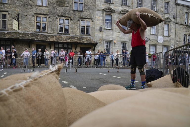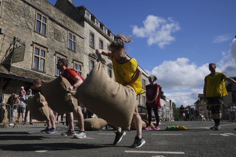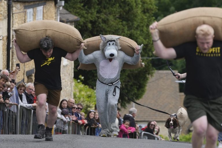 Každoročné preteky Woolsack Races sa konajú vo vlnenom mestečku Tetbury, kde tímy mužov, žien a detí nesú vrecia. britskej vlny. Foto: SITA/AP