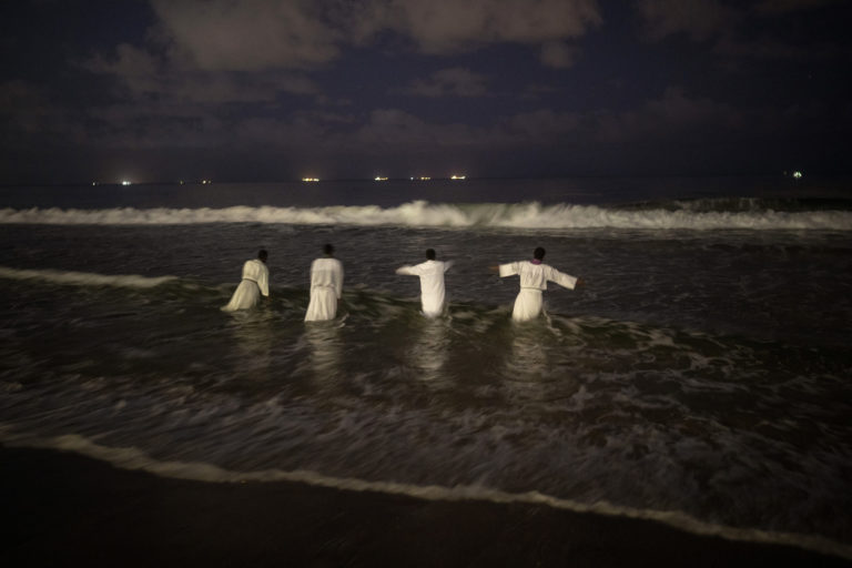 Kňazi z kostola Intokozo Yamakrestu vstupujú do mora predtým, ako pokrstia veriacich na pláži v Durbane v Južnej Afrike. Foto: SITA/AP