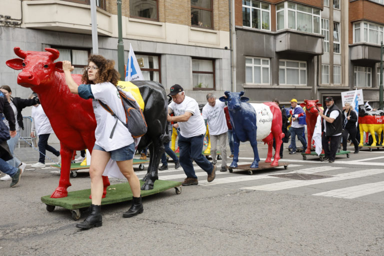 Poľnohospodári protestujú s plastovými kravami v Bruseli. Ministri poľnohospodárstva Európskej únie sa stretli v Bruseli, aby prediskutovali aktuálnu situáciu v sektore poľnohospodárstva. Foto: SITA/AP