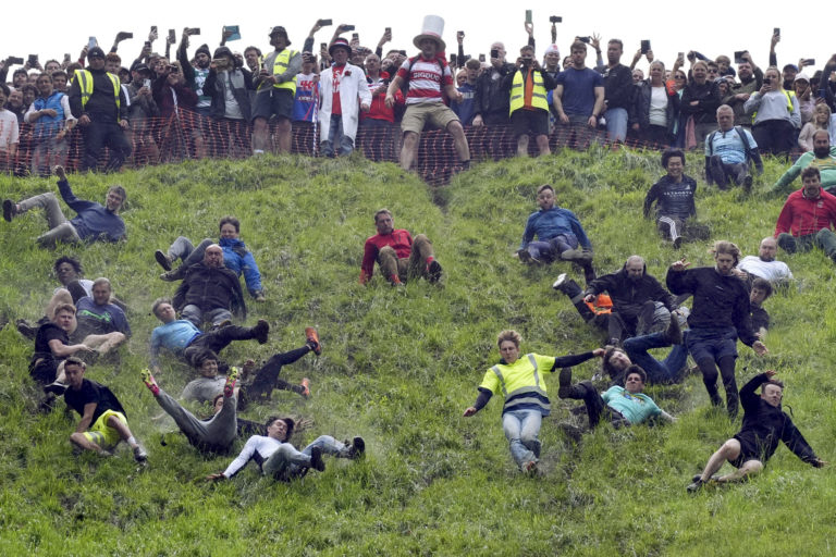 Cheese rolling je v Británii tradičné podujatie, ktoré priťahuje ľudí z celého sveta, ktorí prichádzajú naháňať syr Double Gloucester. Foto: Jacob King/PA via AP