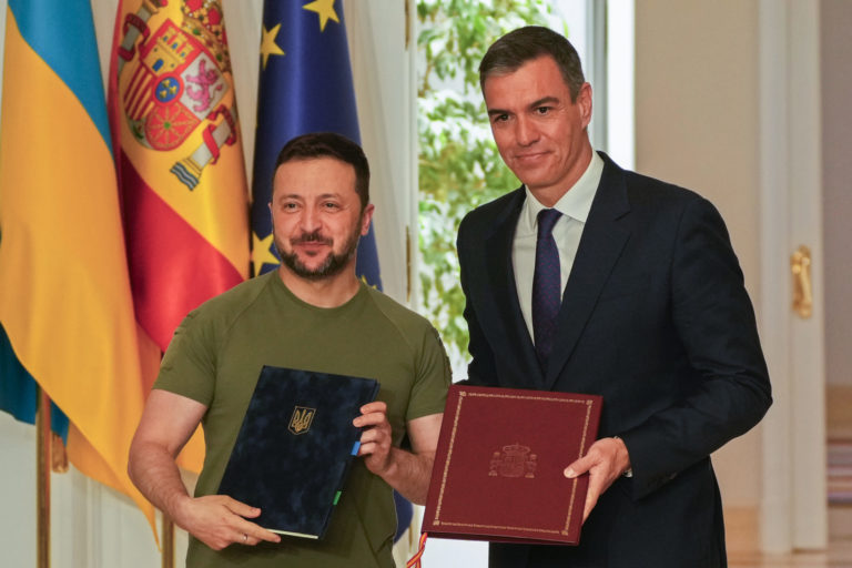 Ukrajinský prezident Volodymyr Zelenskyj (vľavo) a španielsky premiér Pedro Sánchez pózujú s podpísanými bilaterálnymi bezpečnostnými dohodami. Foto: SITA/AP