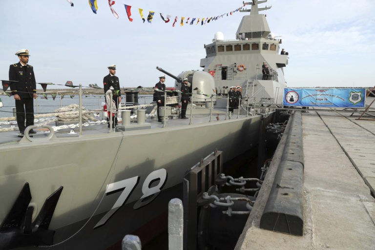 Torpédoborec Deilaman je ukotvený počas ceremónie pri príležitosti jeho inaugurácie na námornej základni v Kaspickom mori v severnom Iráne. Foto: SITA/AP
