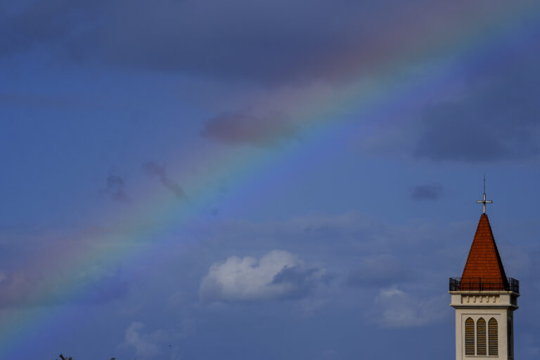 Nad kostolom v centre Bejrútu v Libanone sa v pondelok 27. novembra 2023 objavila dúha. Foto: SITA/AP