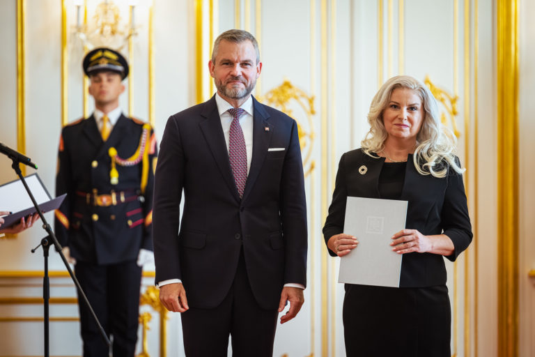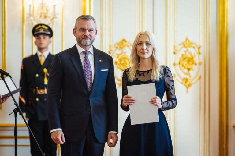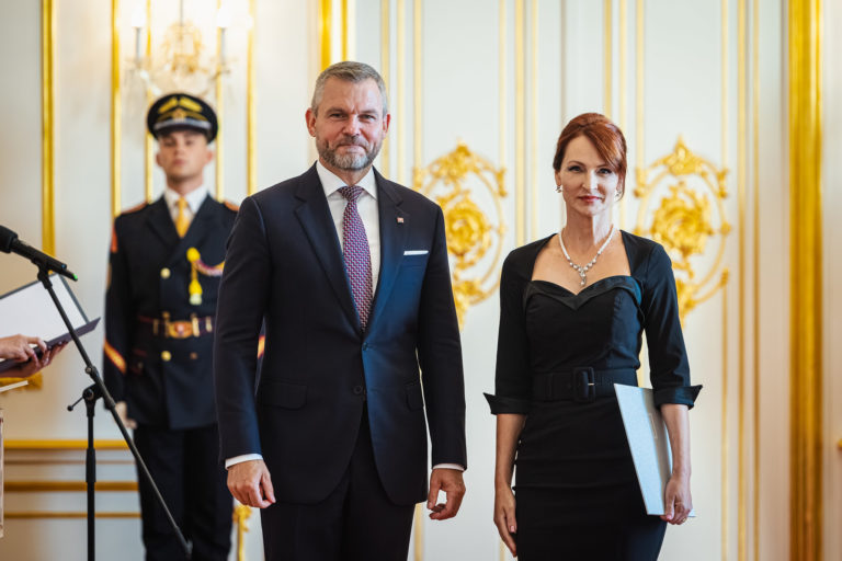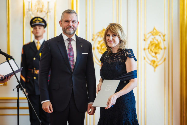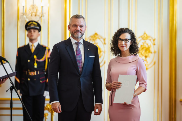 Zľava v popredí: Prezident SR Peter Pellegrini a vymenovaná profesorka v odbore teória a dejiny štátu a práva Martina Jánošíková počas vymenovania nových profesorov vysokých škôl prezidentom SR v Prezidentskom paláci. Bratislava, 28. august 2024. Foto: SITA/Kancelária prezidenta SR