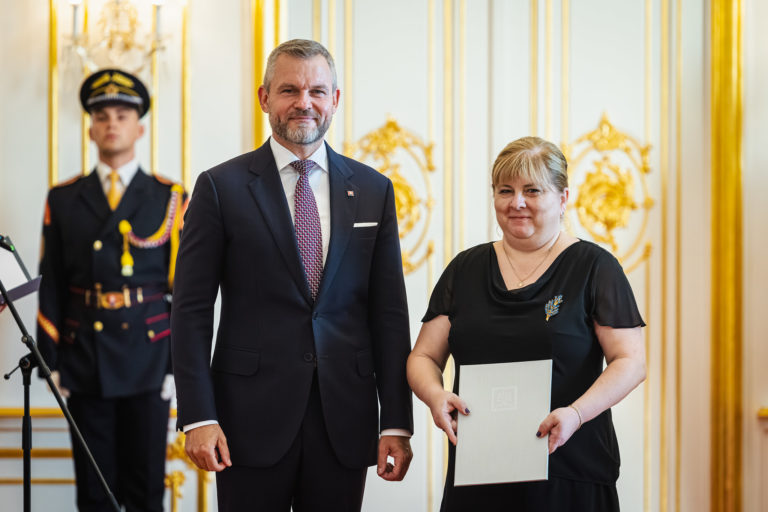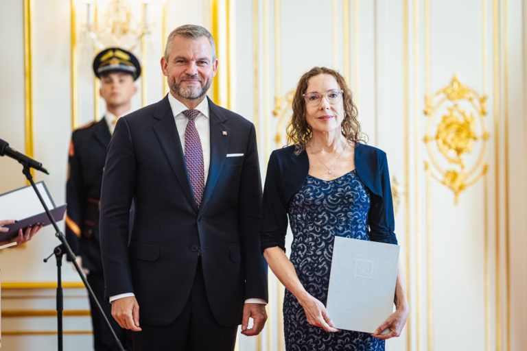 Prezident SR Peter Pellegrini a vymenovaná profesorka v odbore fyzika Iveta Waczulíková počas vymenovania nových profesorov vysokých škôl prezidentom SR v Prezidentskom paláci. Bratislava, 28. august 2024. Foto: SITA/Kancelária prezidenta SR