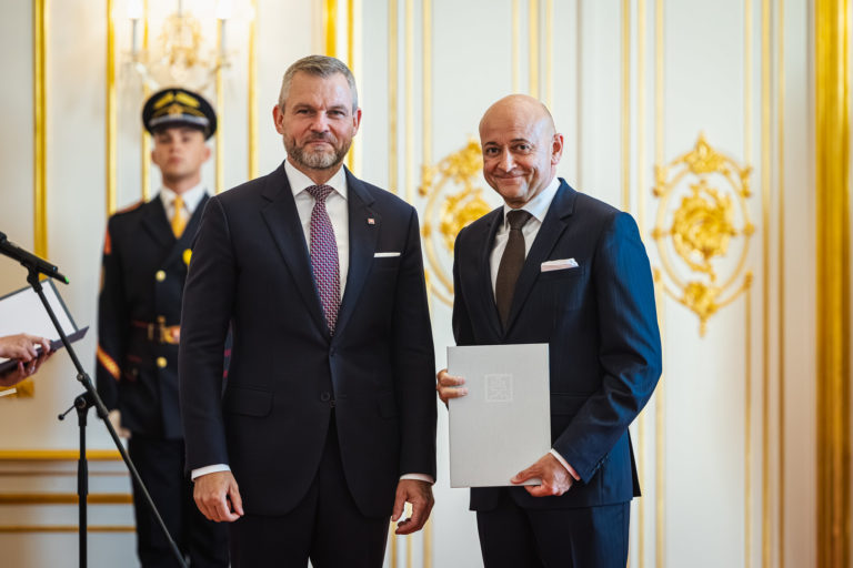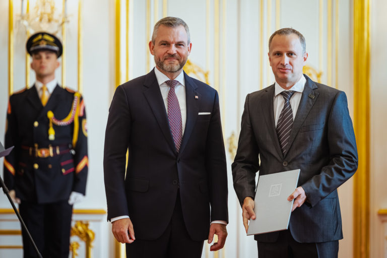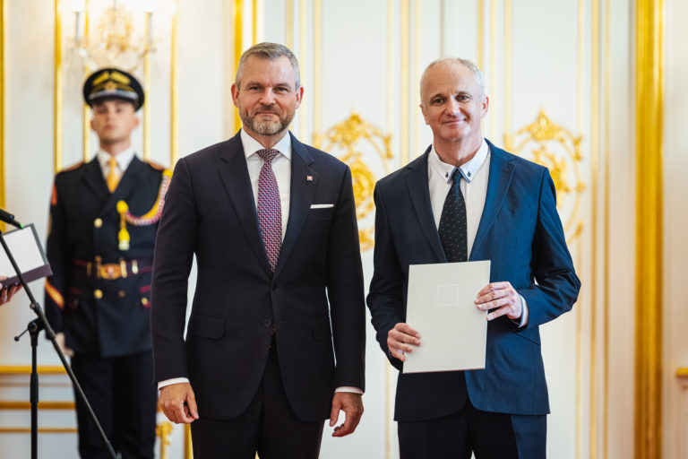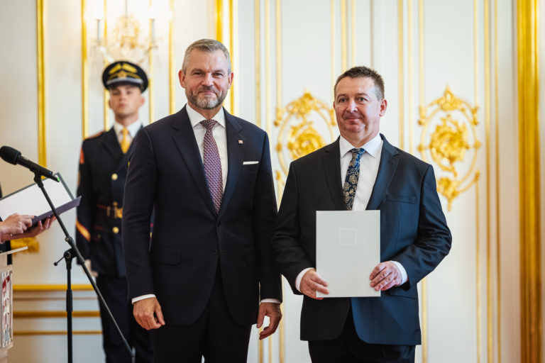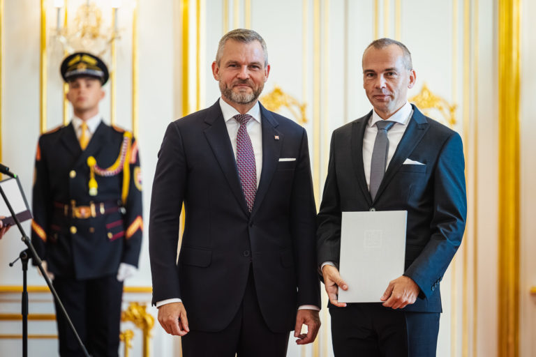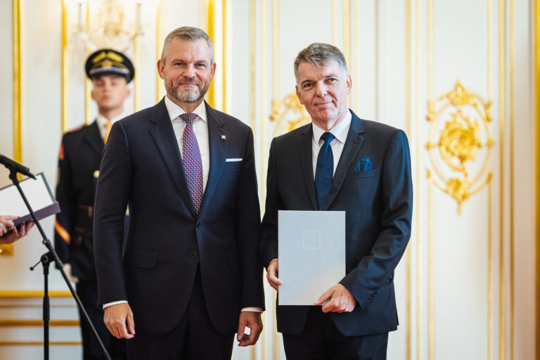Zľava v popredí: Prezident SR Peter Pellegrini a vymenovaný profesor v odbore inžinierske konštrukcie a dopravné stavby Viktor Borzovič počas vymenovania nových profesorov vysokých škôl prezidentom SR v Prezidentskom paláci. Bratislava, 28. august 2024. Foto: SITA/Kancelária prezidenta SR