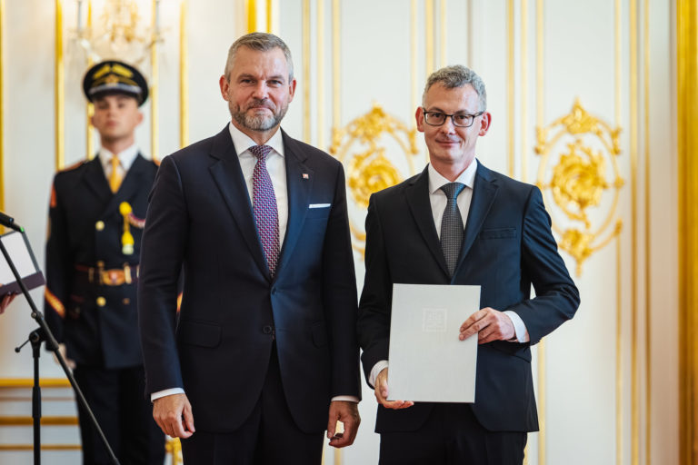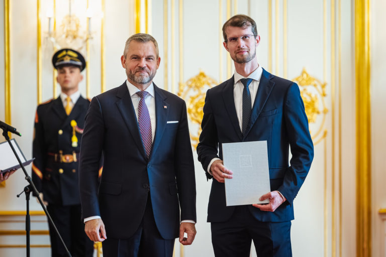 Zľava v popredí: Prezident SR Peter Pellegrini a vymenovaný profesor v odbore technológia makromolekulových látok Michal Jablonský počas vymenovania nových profesorov vysokých škôl prezidentom SR v Prezidentskom paláci. Bratislava, 28. august 2024. Foto: SITA/Kancelária prezidenta SR