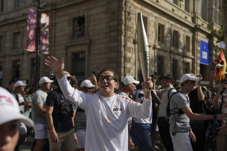 Jackie Chan nesie paralympijskú pochodeň na otváracom ceremoniáli v Paríži. Foto: SITA/AP