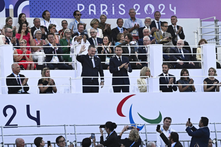 Prezident Medzinárodného paralympijského výboru Andrew Parsons (tretí zľava), francúzsky prezident Emmanuel Macron, jeho manželka Brigitte Macron, prezident Organizačného výboru olympijských a paralympijských hier v Paríži Tony Estanguet a starostka Paríža Anne Hidalgo na otváracom ceremoniáli. Foto: Julien De Rosa/Pool Photo via AP