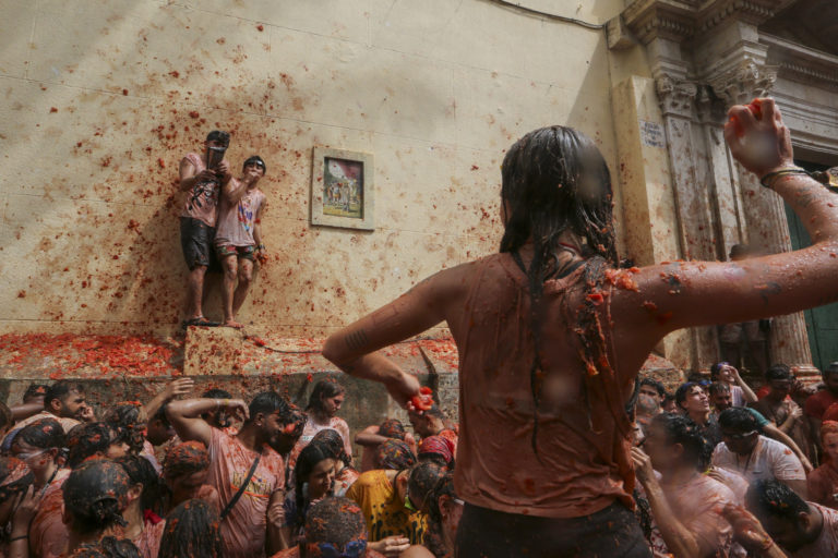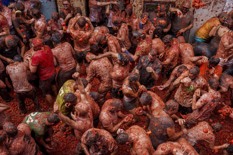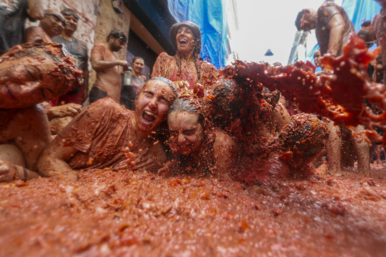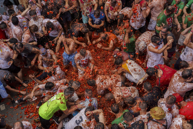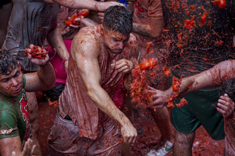 Ľudia na seba hádžu paradajky na španielskom festivale La Tomatina. Foto: SITA/AP