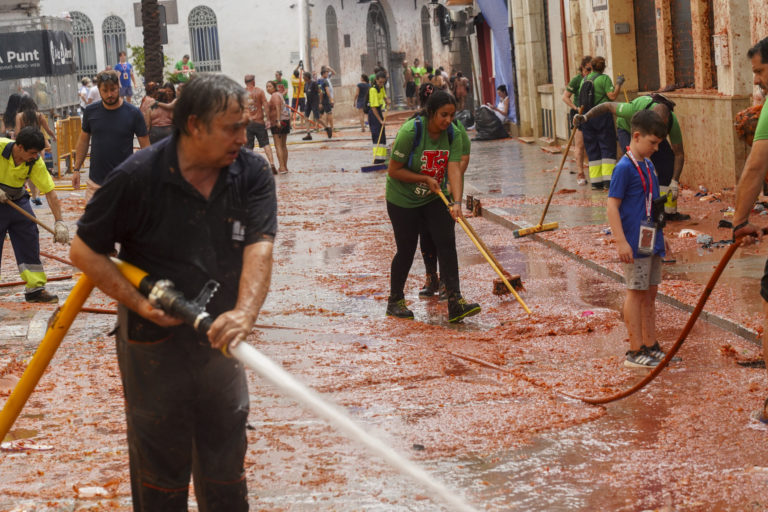 Ľudia čistia ulice po paradajkovej bitke pri Valencii. Foto: SITA/AP
