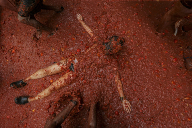 Ľudia ležia v rozpučených paradajkách na festivale La Tomatina. Foto: SITA/AP