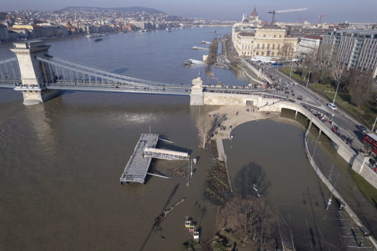 Záplava Dunaja pri Reťazovom moste v centre Budapešti. Foto: Zoltan Mathe/MTI via AP