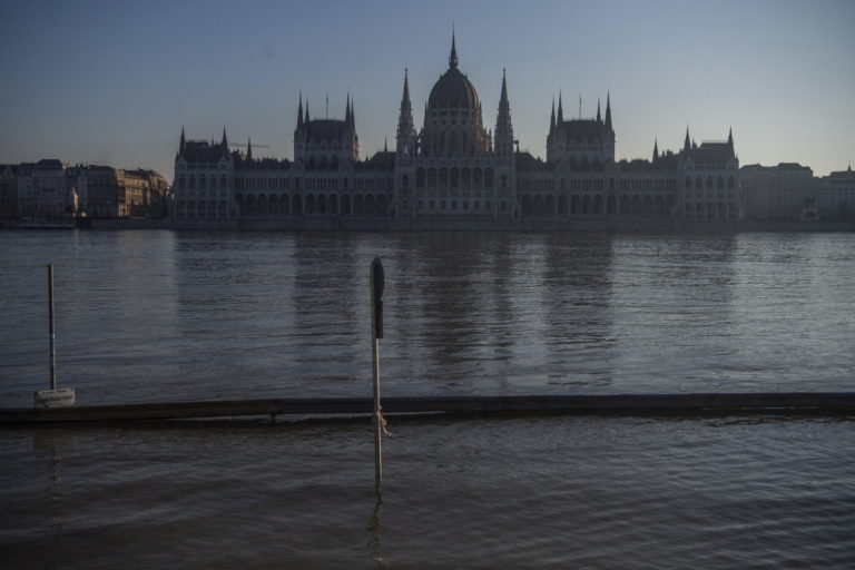 Dunaj sa vylila na breh a zaplavil nábrežie Angelo Rotta v centre Budapešti. Foto: Zoltan Balogh/MTI via AP