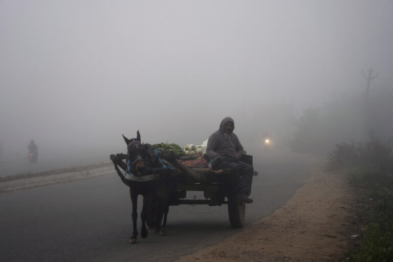 Predavač na konskom voze v hustej hmle v indickom Džammú. Foto: SITA/AP