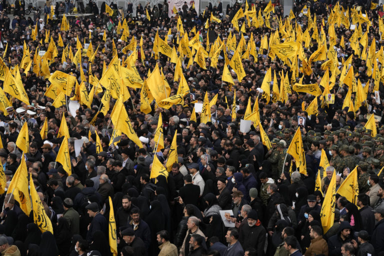 Iránski smútiaci na pohrebnom obrade Seyeda Raziho Mousaviho, vysokopostaveného iránskeho generála polovojenských Revolučných gárd. Foto: SITA/AP