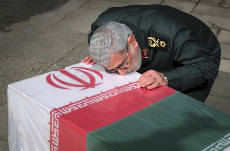 Generál Esmail Ghaani pri rakve Seyeda Raziho Mousaviho, vysokopostaveného iránskeho generála polovojenských Revolučných gárd. Foto: Office of the Iranian Supreme Leader via AP