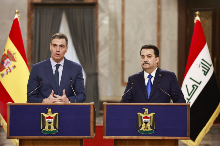 Španielsky premiér Pedro Sanchez (vľavo) a iracký premiér Mohammed Shia al-Sudani na tlačovej konferencii v irackom Bagdade. Foto: Thaier Al-Sudani/Pool Photo via AP