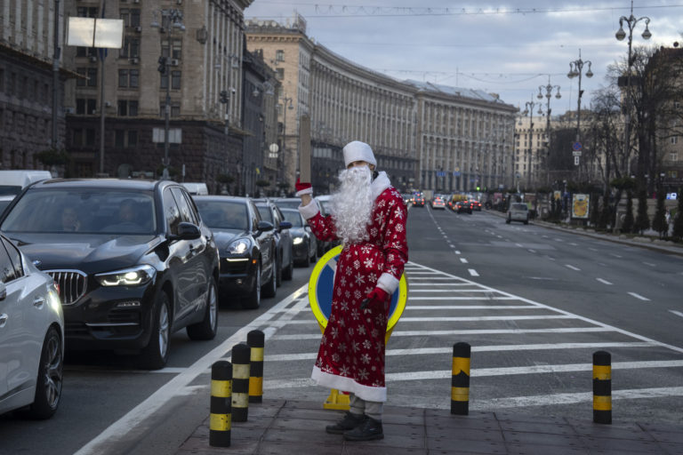 Muž oblečený ako Santa Claus víta okoloidúce autá niekoľko dní pred Novým rokom na hlavnej ulici v Kyjeve. Foto: SITA/AP