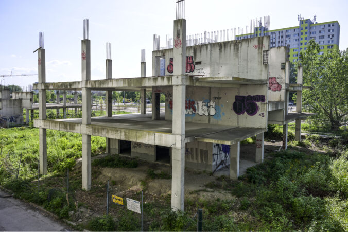 Pohľad na chátrajúce stavby pôvodného projektu Domino v Petržalke v časti Lúky v Bratislave. Bratislava, 23. apríl 2025. Foto: SITA/Milan Illík