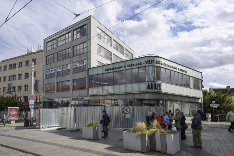 Exteriér budúceho Domu Európy v bývalom Dome obuvi Veľký Baťa na Hurbanovom námestí v Bratislave, ktorý predstavila Kancelária Európskeho parlamentu na Slovensku. Otvorenie nového Domu Európy pre verejnosť je naplánované na koniec roka 2026. Bratislava, 15. máj 2025. Foto: SITA/Milan Illík