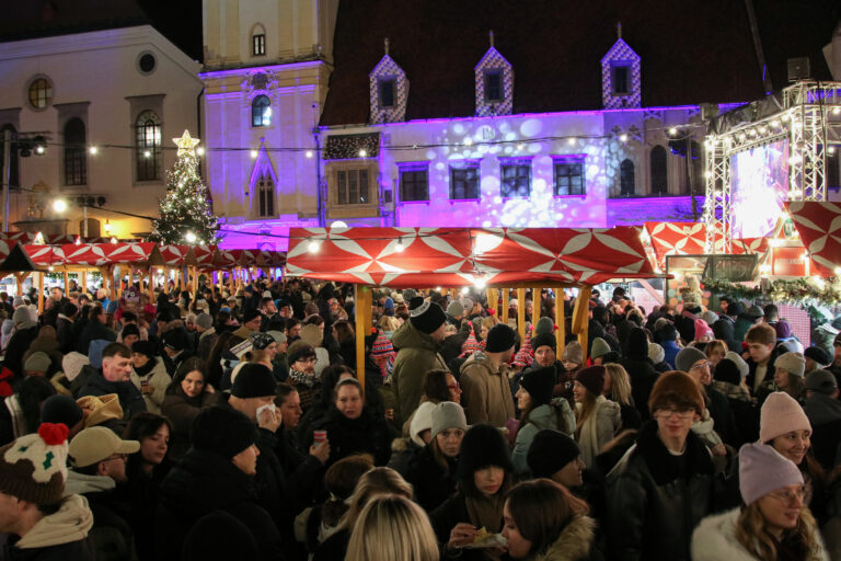 Ľudia na vianočnom trhu a rozsvietený stromček na Hlavnom námestí v Bratislave počas slávnostného otvorenia Bratislavských Vianoc. Bratislava. 28. november 2025. Foto: SITA/Andrea Mezeiová
