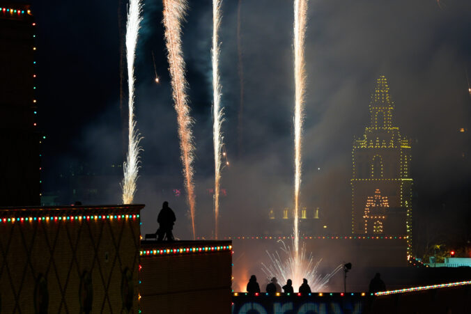 Ľudia na strechách domov sledujú ohňostroj počas slávnostného rozsvecovania vianočných svetiel v nákupnej štvrti Country Club Plaza v Kansas City. Missouri, 27. novembra 2025. Foto: AP Photo/Charlie Riedel