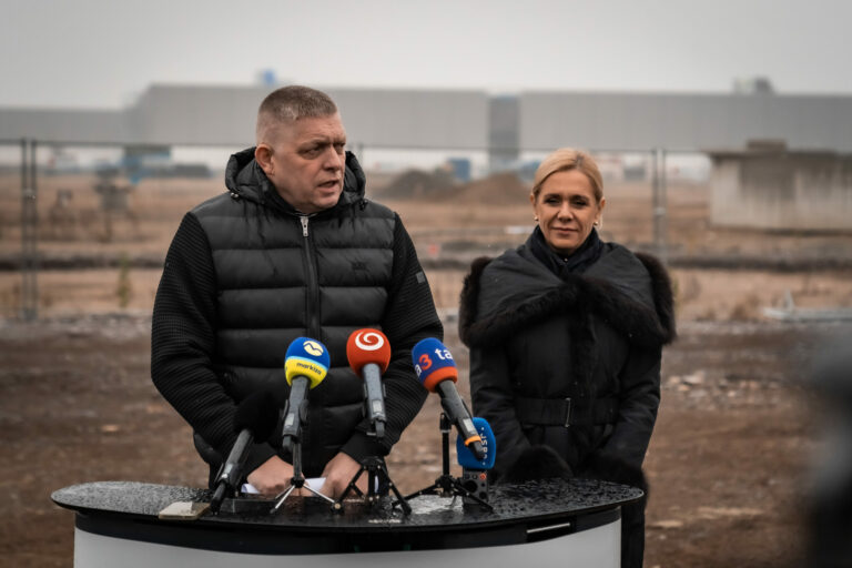 Sprava: Podpredsedníčka vlády a ministerka hospodárstva SR Denisa Saková a predseda vlády SR Robert Fico počas brífingu po stretnutí predsedu vlády SR a ministerky hospodárstva SR s predstaviteľmi Valaliky Industrial Park a MH Invest a obhliadke staveniska v Priemyselnom parku Valaliky v súvislosti so zisteniami Najvyššieho kontrolného úradu (NKÚ) SR. Valaliky, 28. november 2024. Foto: SITA/Úrad vlády SR