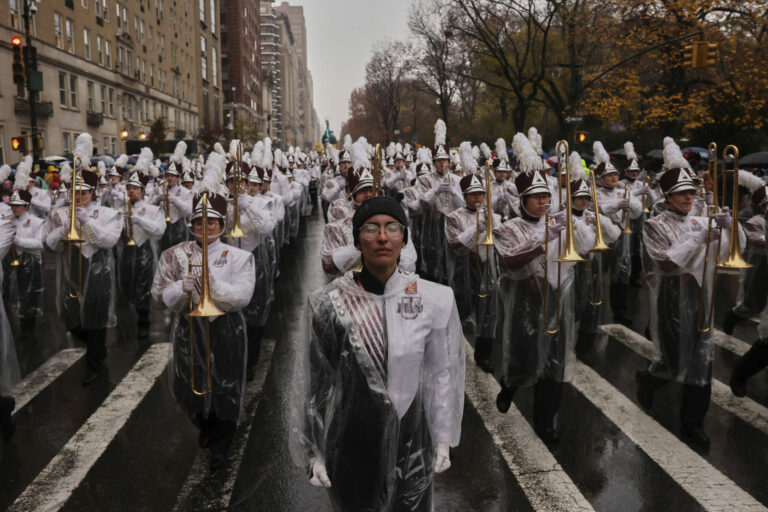 Kapela Minutemen americkej University of Massachusetts pochoduje západnou časťou Central Parku počas Dňa vďakyvzdania v USA. New York, 28. november 2024. Foto: SITA/AP