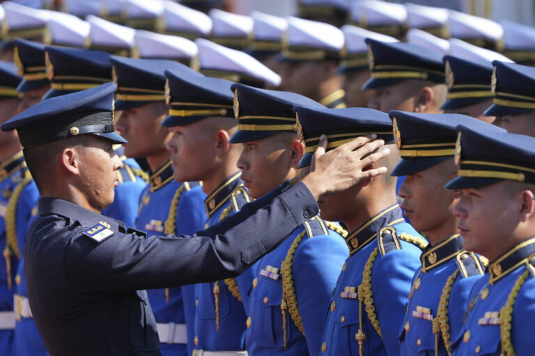 Dôstojník thajského letectva upravuje čiapku členovi čestnej stráže v rámci prípravy na príchod singapurského premiéra Lawrencea Wonga do Thajska. Bangkok, 28. november 2024. Foto: SITA/AP