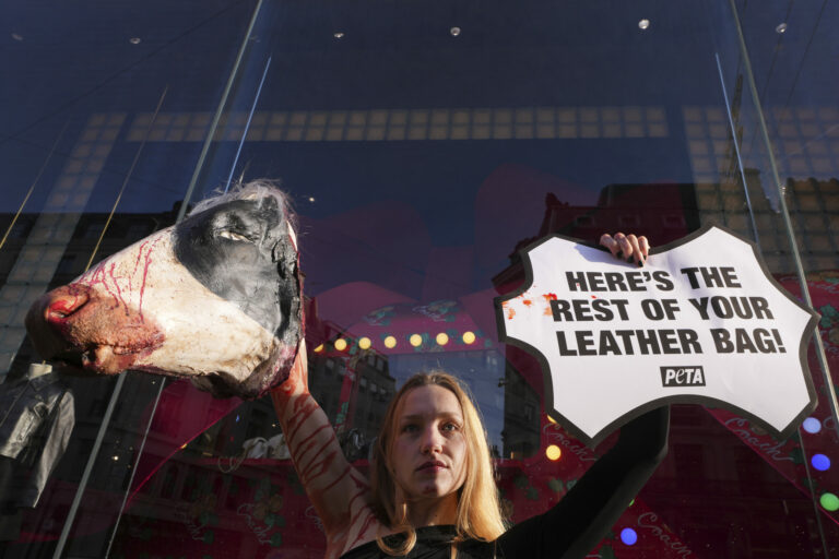Podporovateľka organizácie PETA (Ľudia za etické zaobchádzanie so zvieratami) zobrazuje realistickú „krvácajúcu“ odrezanú kravskú hlavu, pričom drží ceduľu s nápisom: „Tu je zvyšok vašej koženej tašky!“ pred obchodom Coach na Regent Street v Londýne. 28. november 2024. Foto: SITA/AP