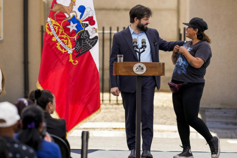 Čilský prezident Gabriel Boric (vľavo) počas odovzdávania sociálneho bývania na predmestí hlavného mesta Čile. Santiago, 28. november 2024. Foto: SITA/AP