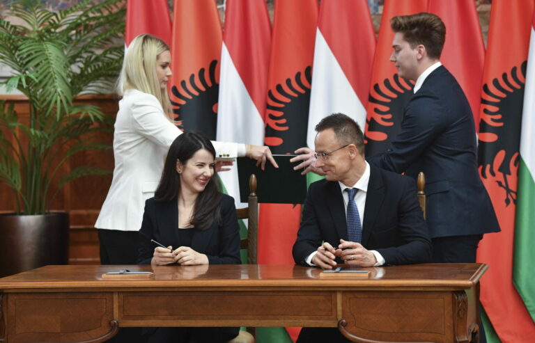 Albánska ministerka pre verejnú správu a boj proti korupcii Adea Pirdeni (vľavo) a maďarský minister zahraničných vecí a obchodu Péter Szijjártó počas spoločného stretnutia v Maďarsku. Budapešť, 28. november 2024. Foto: MTI via AP