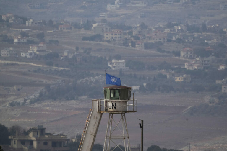 Vlajka OSN na vrchole veže v základni mierových síl Organizácie Spojených národov v Libanone (UNIFIL) na izraelsko-libanonskej hranici pri pohľade zo severného Izraela. 28. november 2024. Foto: SITA/AP