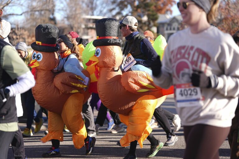 Bežci sa počas Dňa vďakyvzdania v USA zúčastňujú 51. ročníka Mile High United Way Turkey Trot, behu moriakov v Denveri. 28. november 2024. Foto: SITA/AP