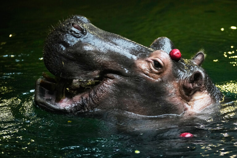 Hroch s jablkom na hlave počas nadchádzajúcich halloweenskych osláv v pražskej zoo. Česká republika, 28. októbra 2025. Foto: (AP Photo/Petr David Josek)