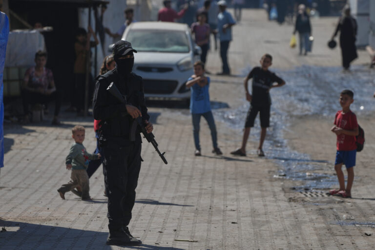 Členovia brigád al-Kásam, vojenského krídla Hamasu, stoja na mieste, kde spolu s egyptskými robotníkmi a strojmi hľadajú telá rukojemníkov v Nuseirate. Pásmo Gazy, 28. októbra 2025. Foto: (AP Photo/Abdel Kareem Hana)