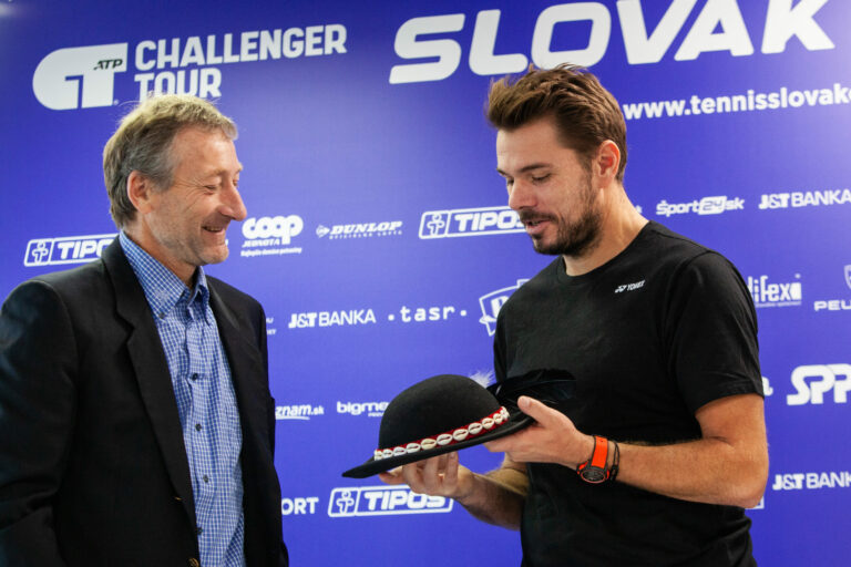 Zľava: Prezident Slovenského tenisového zväzu Miloslav Mečíř a tenisový hráč Stan Wawrinka počas tlačovej konferencie Slovenského tenisového zväzu s trojnásobným grandslamovým šampiónom Stanom Wawrinkom, ktorý sa zúčastní turnaja Slovak Open 2024 v priestoroch Národného tenisového centra. Bratislava, 28. október 2024. Foto: SITA/Bokor Tomáš