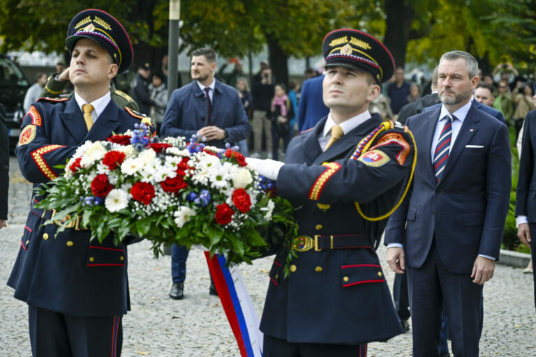 Prezident SR Peter Pellegrini (vpravo) počas položenia venca k Pamätníku československej štátnosti pri príležitosti 106. výročia vzniku samostatnej Československej republiky. Bratislava, 28. október 2024. Foto: SITA/Milan Illík