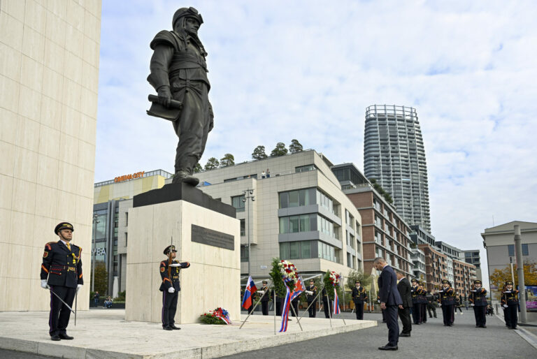 Prezident SR Peter Pellegrini (vpravo v popredí) počas položenia venca k Pamätníku M. R. Štefánika pri príležitosti 106. výročia vzniku samostatnej Československej republiky. Bratislava, 28. október 2024. Foto: SITA/Milan Illík