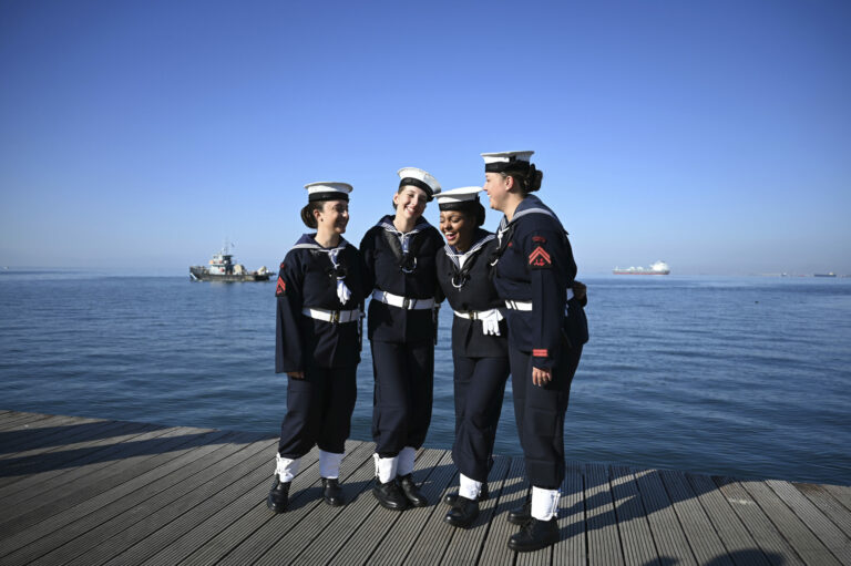 Študentky Helénskej námornej akadémie pózujú pri fotení pred vojenskou prehliadkou počas osláv vstupu Grécka do druhej svetovej vojny. Solún, 28. október 2024. Foto: SITA/AP