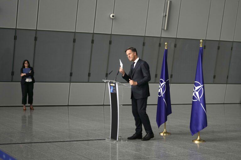 Generálny tajomník NATO Mark Rutte počas svojho vyhlásenia po stretnutí s juhokórejskou delegáciou na vysokej úrovni vrátane najvyšších spravodajských a vojenských predstaviteľov, ako aj vysokých diplomatov v centrále NATO. Brusel, 28. október 2024. Foto: SITA/AP