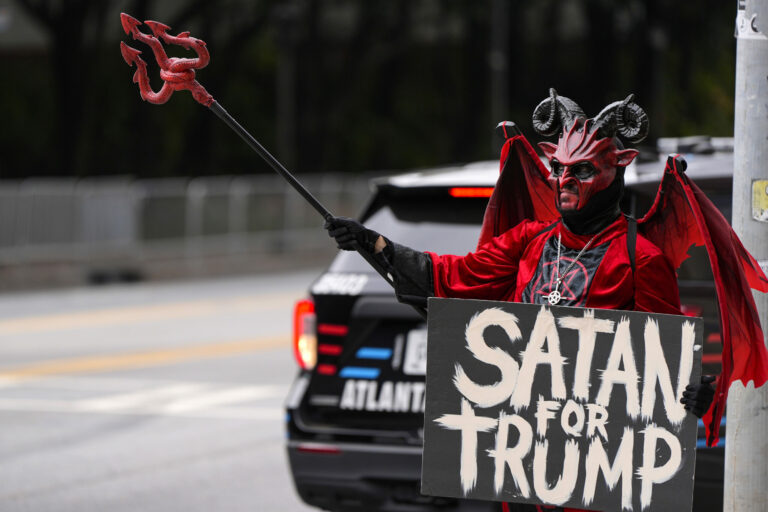 Človek s ceduľou Satan za Trumpa pred vystúpením exprezidenta USA Donalda Trumpa na predvolebnom zhromaždení v štáte Georgia. Atlanta, 28. október 2024. Foto: SITA/AP