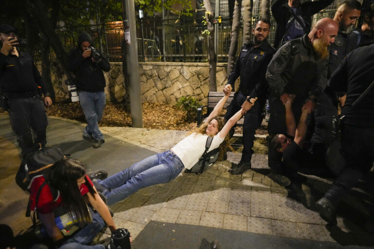 Izraelská polícia rozohnala ľudí protestujúcich proti vláde premiéra Benjamina Netanjahua a vyzývajúcich na prepustenie rukojemníkov zadržiavaných v pásme Gazy militantnou skupinou Hamas. Jeruzalem, 28. október 2024. Foto: SITA/AP
