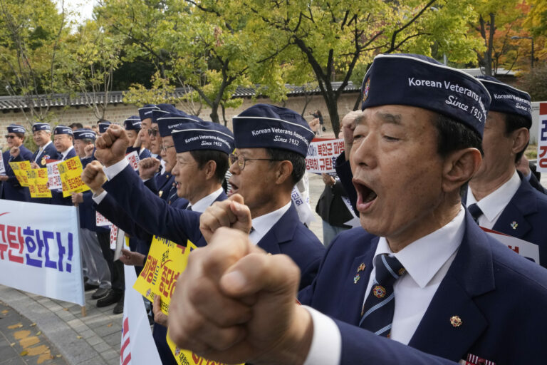 Členovia Kórejskej asociácie veteránov na zhromaždení proti nasadeniu severokórejských jednotiek v Rusku v blízkosti ruského veľvyslanectva v Južnej Kórei. Soul, 28. október 2024. Foto: SITA/AP