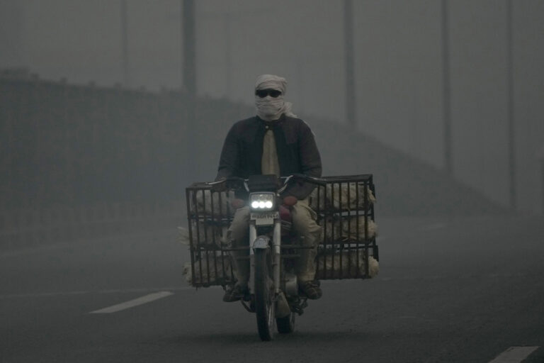 Zahalený muž preváža na motocykli kurčatá v oblasti Pakistanu zahalenej smogom. Lhore, 28. október 2024. Foto: SITA/AP