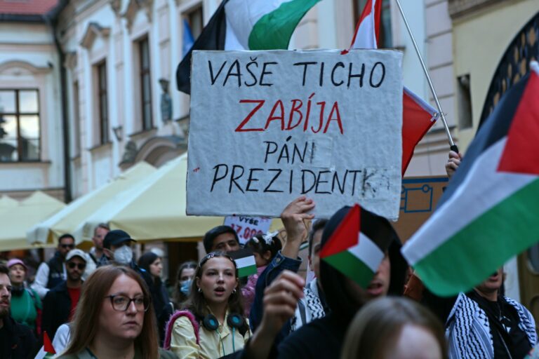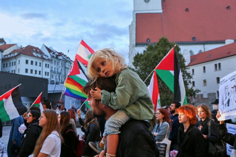 Atmosféra počas mierového pochodu solidarity s Palestínou v Bratislave. Bratislava, 28. september 2024. Foto: SITA/Tomáš Susko