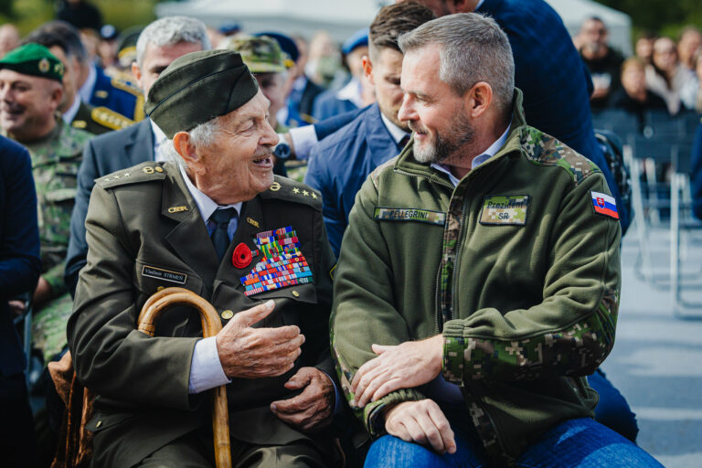 Sprava v popredí: Prezident SR Peter Pellegrini a veterán Slovenského národného povstania (SNP) Vladimír Strmeň počas osláv Dňa ozbrojených síl (OS) SR v Brezovej pod Bradlom za účasti prezidenta SR. Brezová pod Bradlom, 28. september 2024. Foto: SITA/Kancelária prezidenta SR