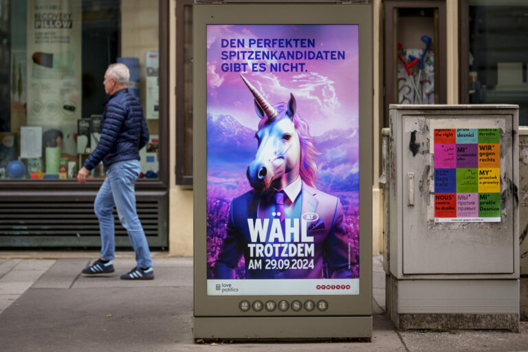 Muž prechádza okolo pútača s odkazom „Dokonalý kandidát neexistuje – voľte aj tak“ pred parlamentnými voľbami v Rakúsku. Viedeň, 28. september 2024. Foto: SITA/AP