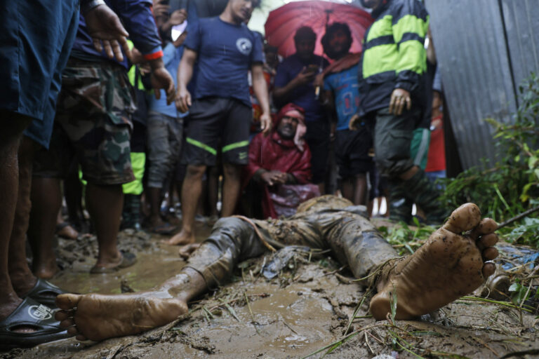 Ľudia stoja pri tele obete povodne v Nepále. Káthmandú, 28. september 2024. Foto: SITA/AP
